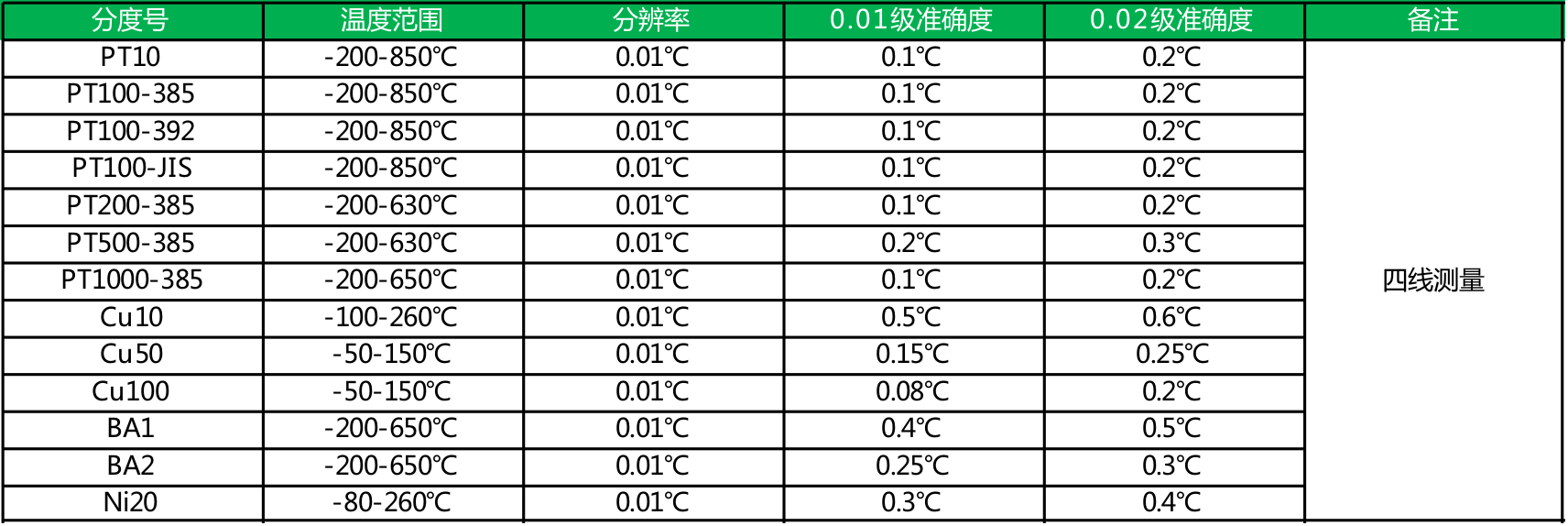 ● 热电阻种类:PT100-385,PT100-392,PT100-JIS,PT200-385,PT500-385,PT1000-385,Cu10,Cu50,Cu100,Nil20,BA1,BA2,PT10;